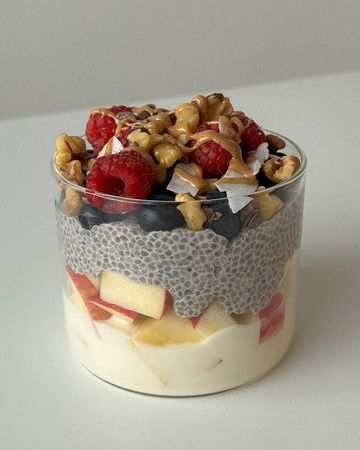 Chia pudingini hazırlamak için chia tohumlarını sütle karıştırıp birkaç saat dolapta bekletin. Bir bardağa önce yoğurdu ve küp doğranmış elmayı koyun, üzerine hazırladığınız chia pudingini ekleyin. En üste yaban mersini, frambuaz, ceviz ve akışkan fıstık ezmesini ekleyerek servis edin.